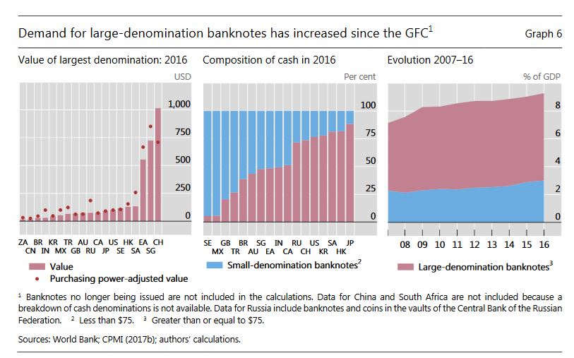 Oddly, even as developed countries are seeing fewer transactions completed using cash, the quantity of banknotes outstanding has jumped. This increase in cash outstanding, which generally exceeds GDP growth, is mostly due to an increase in demand for large-value denominations, as the chart below illustrates: